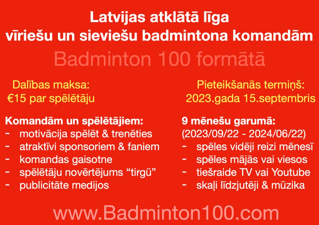 Skolas tiek aicinātas pieteikties uz Latvijas skolu komandu čempionātu badmintonā, kas norisināsies 3.decembrī Siguldas sporta centrā. Sacensības notiks “Badminton 100” stafetes formātā, noskaidrojot uzvarētājus sākumskolas, pamatskolas un vidusskolas vecuma grupās. Pieteikšanās termiņš ir 2024.gada 29.novembris.