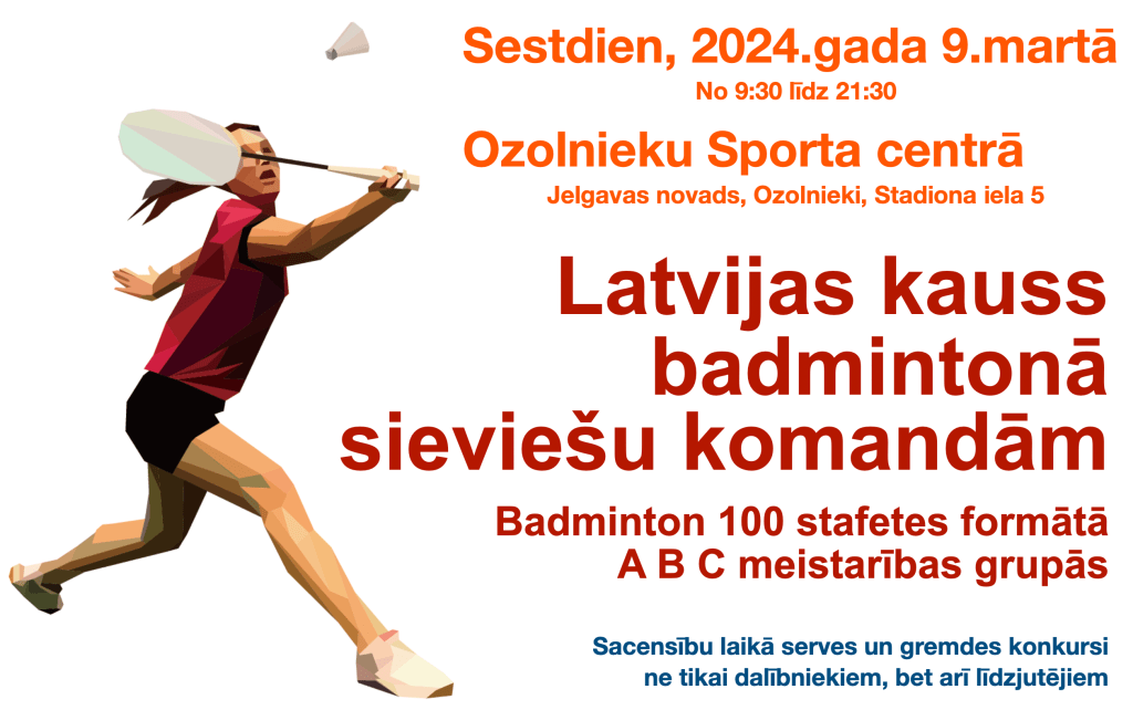 Nākamā dienā pēc Starptautiskās sieviešu dienas, sestdien, 2024.gada 9.martā, Ozolniekos notiks Latvijas kauss badmintonā sieviešu komandām. Līdzīgs turnīrs reiz jau notika turpat Ozolniekos, 2020.gada 8.martā, kad pirmo reizi notika “Alojas” sponsorētais Latvijas sieviešu komandu kauss.